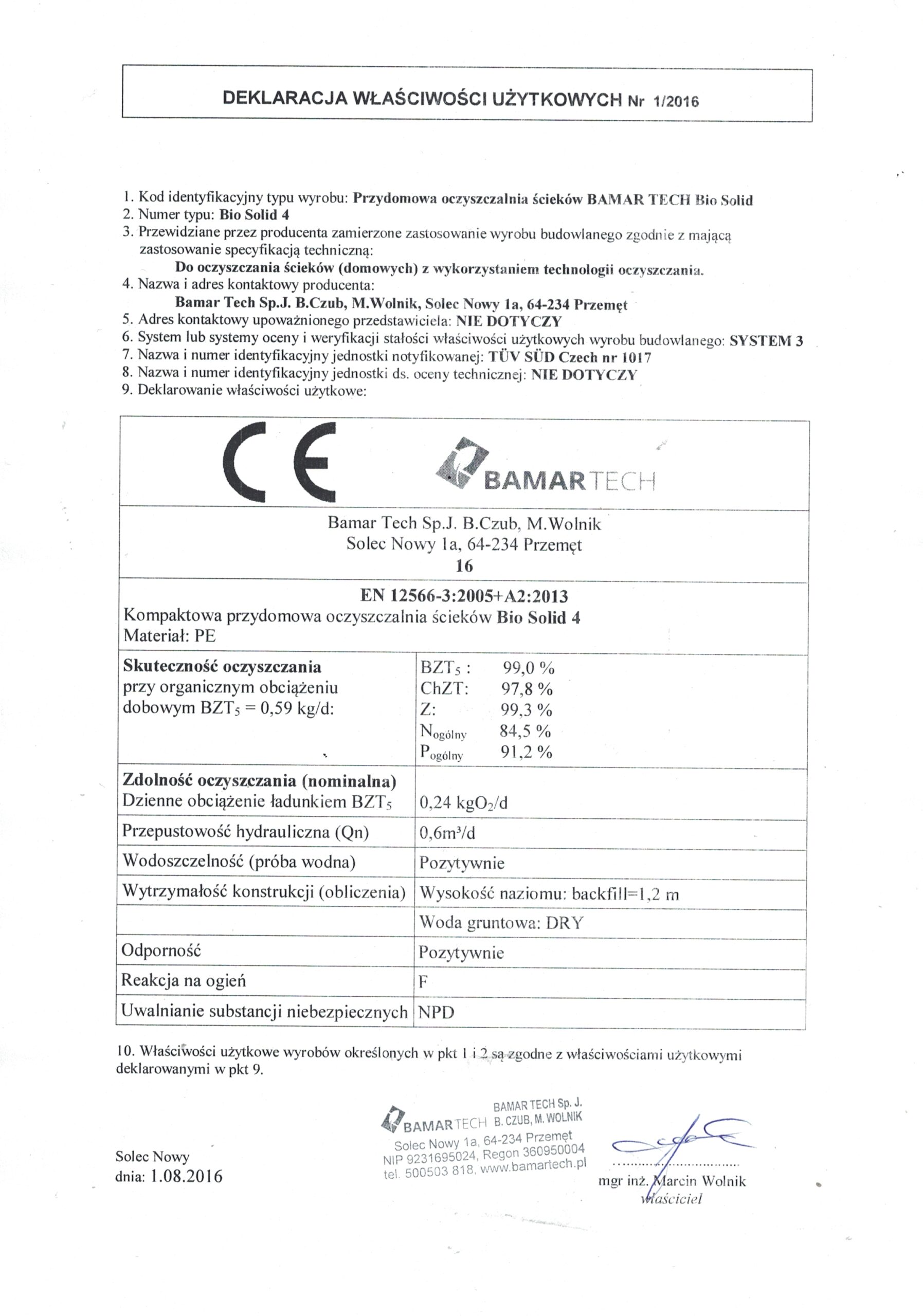 Dodatkowo wszystkie objęte w/w normą parametry: wytrzymałość konstrukcyjna, skuteczność oczyszczania, zdolność oczyszczania, przepustowość hydrauliczna, szczelność zbiornika, trwałość są potwierdzone przez Producentów Deklaracjami Własności Użytkowych. Nasze urządzenia znakowane są znakiem bezpieczeństwa CE.